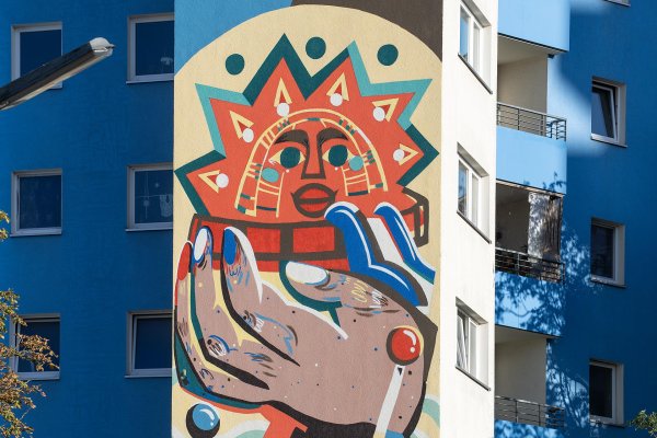 Back in May 2025, a Community Wall was created at Maulbeerallee 31 as a preparation for the project—designed in collaboration with children from the Christian Morgenstern Elementary School. This colorful, graphically stylized piece combines elements of comic art, pop art, and symbolic iconography—just like ONE WALL—and marked the beginning of a dialogue with the local community.