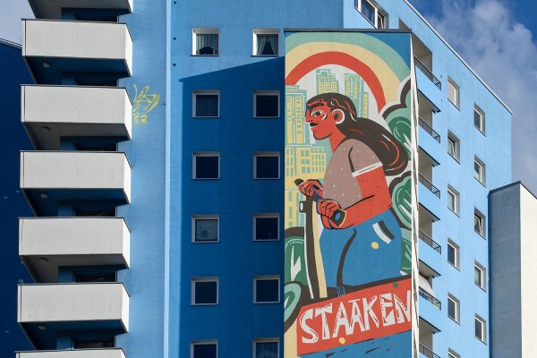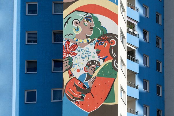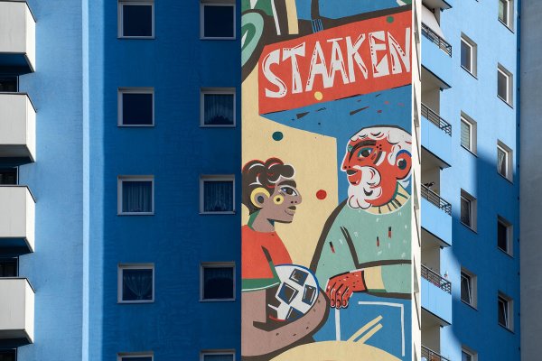 Two women in a heartfelt embrace symbolize closeness and mutual support. The chestnut leaf in one of their hands references the tree-lined avenues of the neighborhood, while a rainbow stands for openness, diversity, and connection—such as that found in the PI Café, a space for women to meet and share. A boy with a soccer ball represents the popular neighborhood playing fields. An elderly man watches him from his balcony—an image of intergenerational perspective and urban coexistence. Higher up, a girl glides through the neighborhood on her skateboard—full of energy and confidence. Behind her, the skyline of Staaken unfolds—a cityscape woven between housing blocks and treetops.